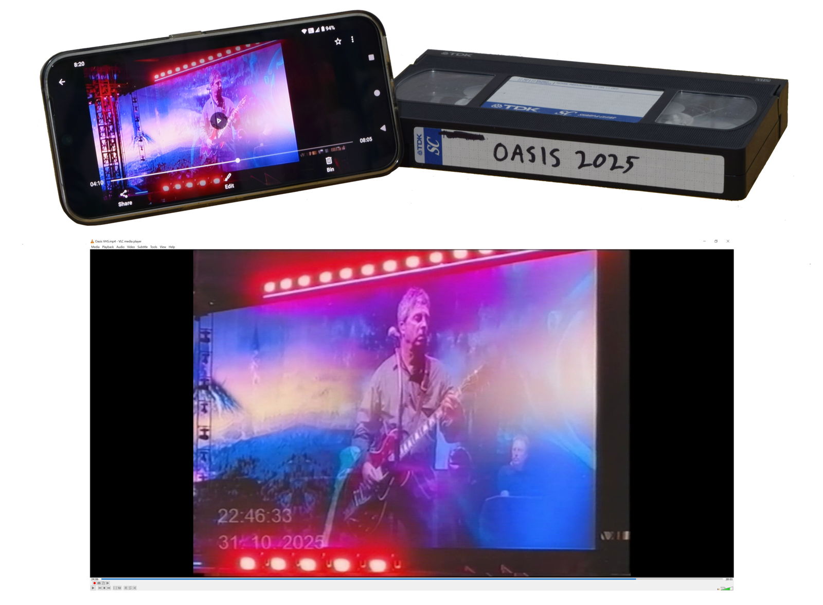 Hi, my name is Alex. I like watching things on old VHS tapes. I also like the band Oasis. So naturally in the days after attending an Oasis concert in late 2025, I took some of the footage I recorded on my phone and put it onto a VHS tape. I showed the video to a friend, who suggested that there would be people out there who would love to see their own modern videos look like this. I wasn’t so sure, but I did some research and it turns out I’m not the only one with 90s nostalgia. I’m also not the only one who wants to see their modern videos in VHS style without resorting to unconvincing filters or AI. I never threw out my VHS tapes or my VCR’s knowing that maybe one day I would make use of them again.